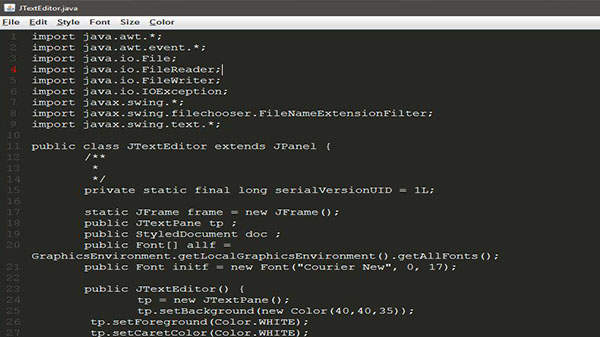 A basic text editor having basic functions of user typing in the data, saving the file, opening a new file, cut,copy,paste, search and replace a word, change colors, font, font size of the selected text.